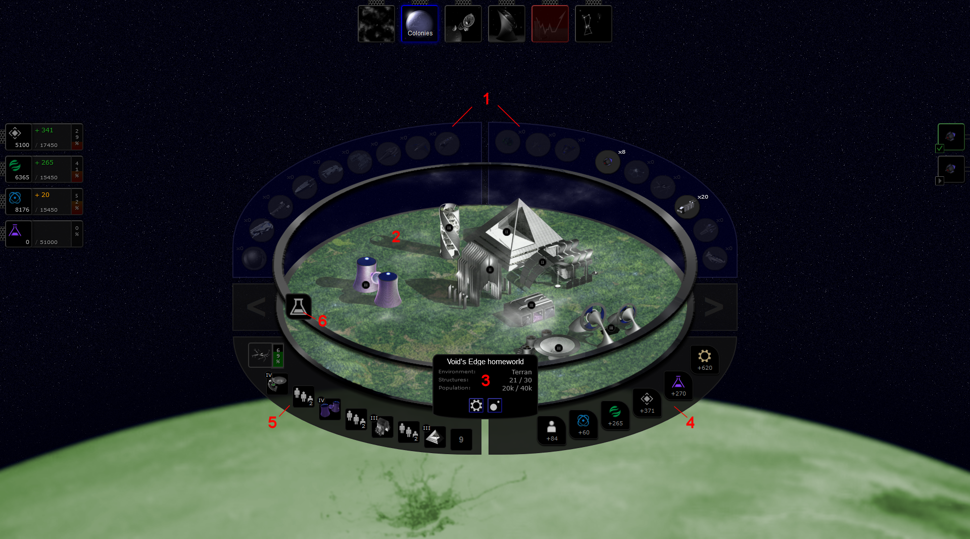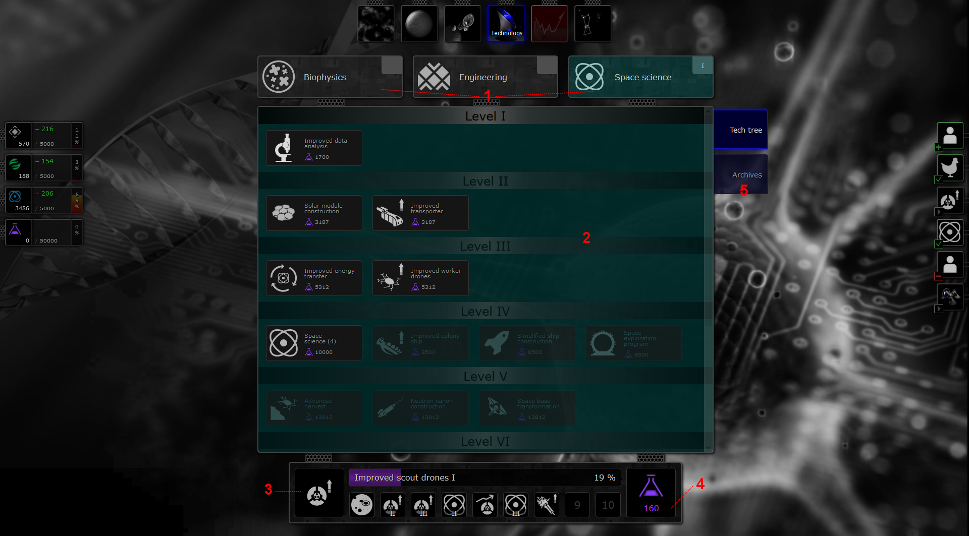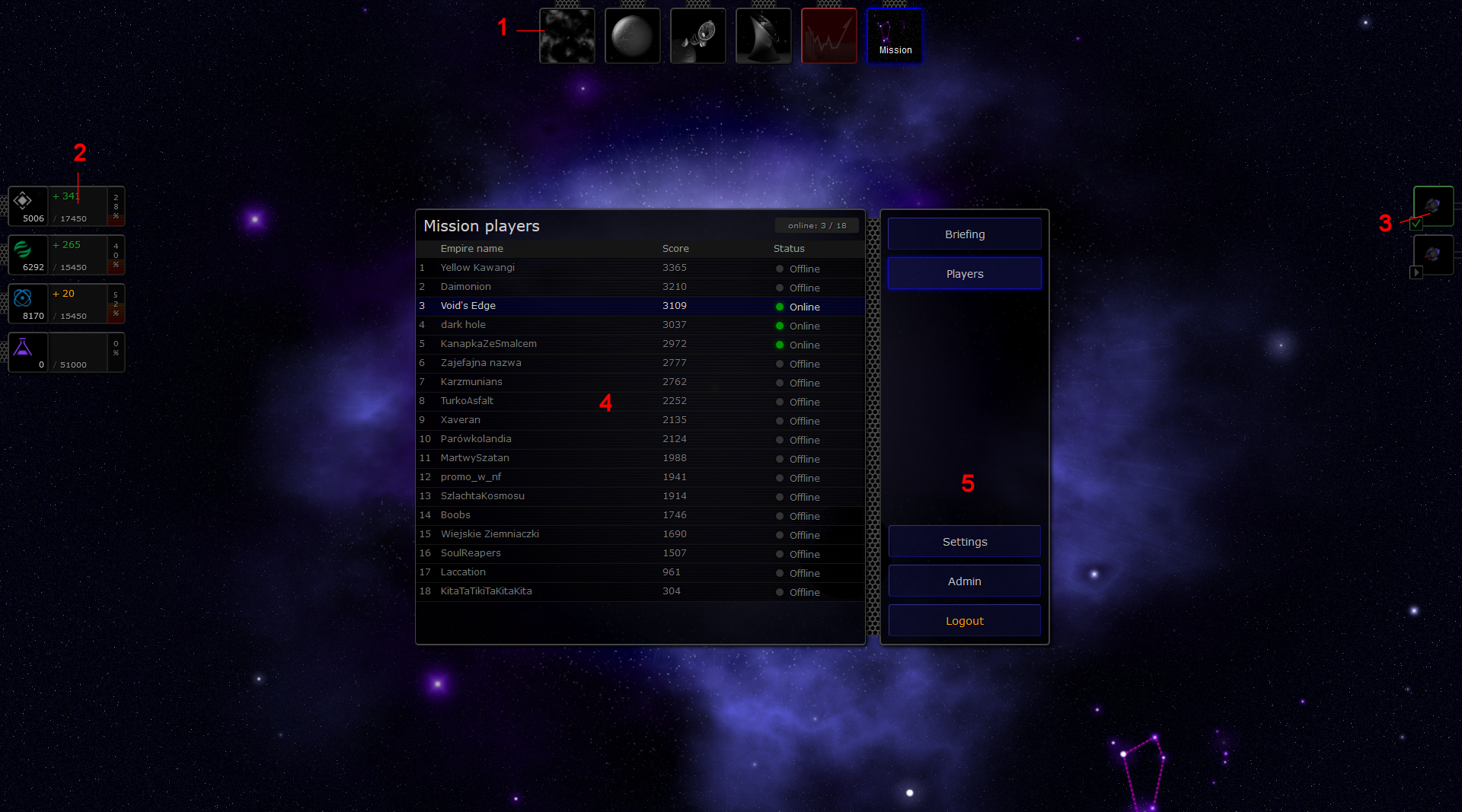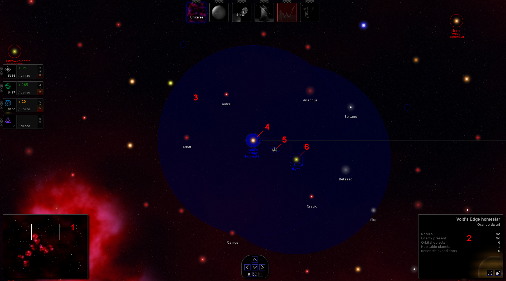 Pokaż źródło stronyPoprzednie wersjeOdnośnikiDo góry Share via Share via... Twitter LinkedIn Facebook Pinterest Telegram WhatsApp Yammer Reddit TeamsOstatnie zmianySend via e-MailDrukujPermalink × Poradnik początkującego gracza Czyli krótki poradnik jak zacząć zarządzać kosmicznym imperium… Ekran startowy (Misja) Po pierwszym logowaniu zostaniesz przekierowany do tzw. widoku Misji. Widok misji zawiera podstawowe informacje o celu rozgrywki oraz o graczach uczestnicząc w rozgrywce. Legenda: 1 - Menu nawigacyjne (dostępne widoki w grze), 2 - Wskaźniki zasobów, 3 - Panel notyfikacji, 4 - Punktacja (siła) poszczególnych graczy, 5 - Menu misji Menu nawigacyjne, Wskaźniki zasobów oraz Panel notyfikacji są widoczne zawsze na każdym z ekranów. Gracz może sterować sposobem prezentacji tych widget-ów (tryb rozwinięty lub kompaktowy) z poziomu okna ustawień: Mission → Settings → Display Jeżeli dopiero co założyłeś sobie konto, koniecznie zmień swoje hasło. Hasło, które otrzymałeś (klucz rejestracyjny) jest długie i trudne do zapamiętania. Hasło możesz zmienić w widoku: Mission → Settings → Account Pierwsza kolonia W następnym kroku polecamy wejść do swojej głównej kolonii (ikona planety w menu głównym na górze) i wrzucić swoim „poddanym” kilka zadań produkcyjnych (przycisk „zębatki” w centralnym panelu informacyjnym). W pierwszej kolejności dobrze jest zlecić budowę kilku kluczowych budynków: Kopalnia - podstawowe źródło surowców mineralnych . Niemal wszystko co można produkować wymaga do budowy surowców mineralnych. Elektrownia - podstawowe źródło energii . Energia potrzebna jest do utrzymania budynków i struktur kosmicznych choć w większych ilościach potrzebna jest dopiero przy lotach kosmicznych lub przy realizacji zadań specjalnych. Bio-faktoria (opcjonalnie) podstawowe źródło bio-komponentów . Zasób ten przyda się aby wyżywić większą ilość kolonistów. Jednym z zastosowań jest również zwiększenie przyrostu naturalnego kolonii. Po budynkach 1 poziomu dobrze jest zlecić (dodać do kolejki zadań) od razu budynki 2 poziomu, które są znacznie bardziej wydajne i oferują nowe opcje w grze. Na początku rozgrywki nie ma jednak sensu rozbudowywać struktur na poziom wyższy niż 3. Ich koszt oraz czas budowy rośnie gwałtownie z poziomem struktury, a lepsze możliwości produkcyjne będziemy mieli po podniesieniu poziomu głównej struktury (Arka) na poziom 2. W każdej kolonii w danym momencie czasu może być realizowane tylko jedno zadanie produkcyjne. Zlecenie większej ilości zadań powoduje umieszczenie ich w kolejce zadań oczekujących. Poziom kolonii (prezentowany między innymi w widoku układu słonecznego) jest tożsamy z poziomem głównej struktury kolonii. Dla kolonii początkowej jest to Arka, dla pozostałych Centrum dowodzenia. Legenda: 1 - Panele z flotą kolonii 2 - Wizualizacja infrastruktury kolonii 3 - Podstawowy panel informacyjny kolonii 4 - Panel dochodów kolonii 5 - Panel produkcji kolonii (kolejka zadań) Badania naukowe Widok „Technologii” to jeden z ważniejszych widoków w grze, który polecamy odwiedzić niezwłocznie po rozpoczęciu rozgrywki. W widoku tym gracz decyduje na jakie technologie są wydawane punkty badawcze , które generuje jego imperium. Zbyt długie zwlekanie z wyznaczeniem kolejki badań może skutkować w zacofaniu naszego imperium :) Legenda: 1 - Gałęzie technologiczne (każda posiada osobną listę technologii), 2 - Lista dostępnych technologi, 3 - Kolejka zleconych badań, 4 - Przychód punktów badawczych (na godzinę), 5 - Zakładka archiwum badań (opracowane już technologie) Więcej o technologiach i cechach specjalnych rasy w rozdziale: Technologie Każda gałąź technologiczna wspomaga inny aspekt i styl rozgrywki. Najlepsze efekty daje skupienie się na jednej wybranej gałęzi technologicznej, z niewielkim zaangażowaniem w pozostałych gałęziach. Pierwsze kroki w kosmosie Widok uniwersum dostępny jest po kliknięciu ikony z mgławicą w menu głównym u góry (pierwsza z lewej). Po wejściu do niego cały ekran powinna wypełnić nam mapa uniwersum, w którym toczymy naszą misję. Legenda: 1 - „Mini-mapa” uniwersum, 2 - Panel szczegółów wybranego obiektu na mapie, 3 - Główna mapa uniwersum, zasięg operacyjny flot gracza na niebieskim tle, 4 - Domowy układ słoneczny gracza, 5 - Lecąca flota gracza, 6 - Inny kontrolowany przez gracza układ słoneczny Po początkowym rozbudowaniu kolonii dobrze jest rozejrzeć się w „okolicy”, czyli zwiedzić pobliskie układy słoneczne. Do tego celu używamy specjalnych statków (Scout), których posiadamy 8 sztuk na start. Niestety są to jednorazowe dron-y, które po wykonaniu powierzonej im misji rozpadają się. Aby wysłać je do innego układu wchodzimy do mapy uniwersum i zaznaczamy kliknięciem pobliską gwiazdę. Wybieramy akcję „Scout” albo z menu kontekstowego (prawy przycisk myszy) albo z panelu szczegółów zaznaczonego obiektu (dolny prawy róg mapy). Szansa na sukces powyższej akcji zależy od ilości wysłanych skautów. Gracz nie może wykonywać żadnych akcji (poza akcją „Scout”) w układach gwiezdnych, których jeszcze nie odkrył. Między innymi nie może wysyłać do takiego nieodkrytego układu statków kosmicznych. Dlatego warto mieć zawsze odkryte wszystkie gwiazdy w naszym zasięgu. Nieodkryte gwiazdy na mapie uniwersum domyślnie mają ukrytą etykietę z nazwą (w przeciwieństwie do odkrytych przez gracza). Wyjątkiem od tej reguły są gwiazdy „domowe” (startowe gwiazdy graczy) Flota gracza może operować na początku na bardzo ograniczonym zasięgu. Zasięg ten jest domyślnie wizualizowany na mapie uniwersum jako niebieskie półprzezroczyste tło. Aby zwiększyć zasięg operacyjny floty gracz musi zakładać nowe bazy kosmiczne w nowych układach gwiezdnych. Posłuży do tego dedykowany typ statu: Statek baza